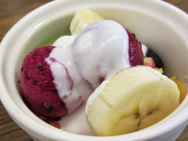 份量不大,但種類很多。有火龍果、香蕉、蘋果、橘子跟優格醬,味道很清爽。